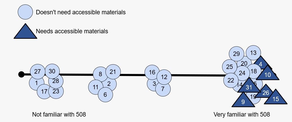 We asked those who required 508 compliant documents specific questions to better understand what employees with disabilities need to fully and independently use materials. Out of everyone interviewed, 19% of participants required 508 compliant materials. Participants’ disabilities included degrees of colorblindness, low vision/blindness, and hearing impairment.