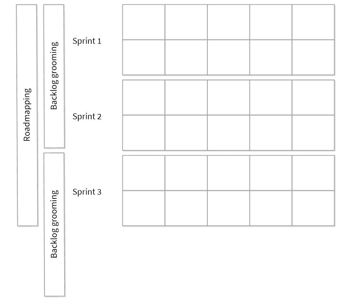 Longer term planning includes three two-week sprints per six-week roadmap, as well as backlog grooming every four weeks.