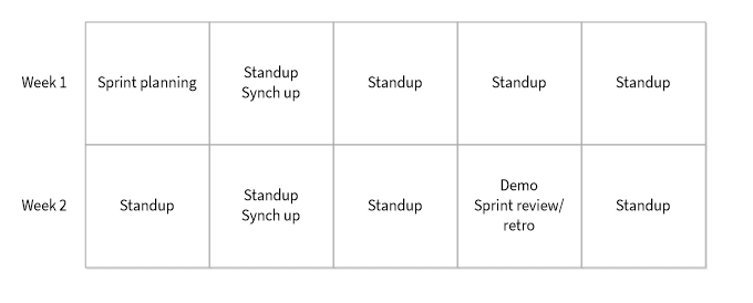 Week one of the two-week sprint contains sprint planning, one synch up and four stand ups. Week two contains a synch up, a sprint review that can include a retro, and four stand ups.