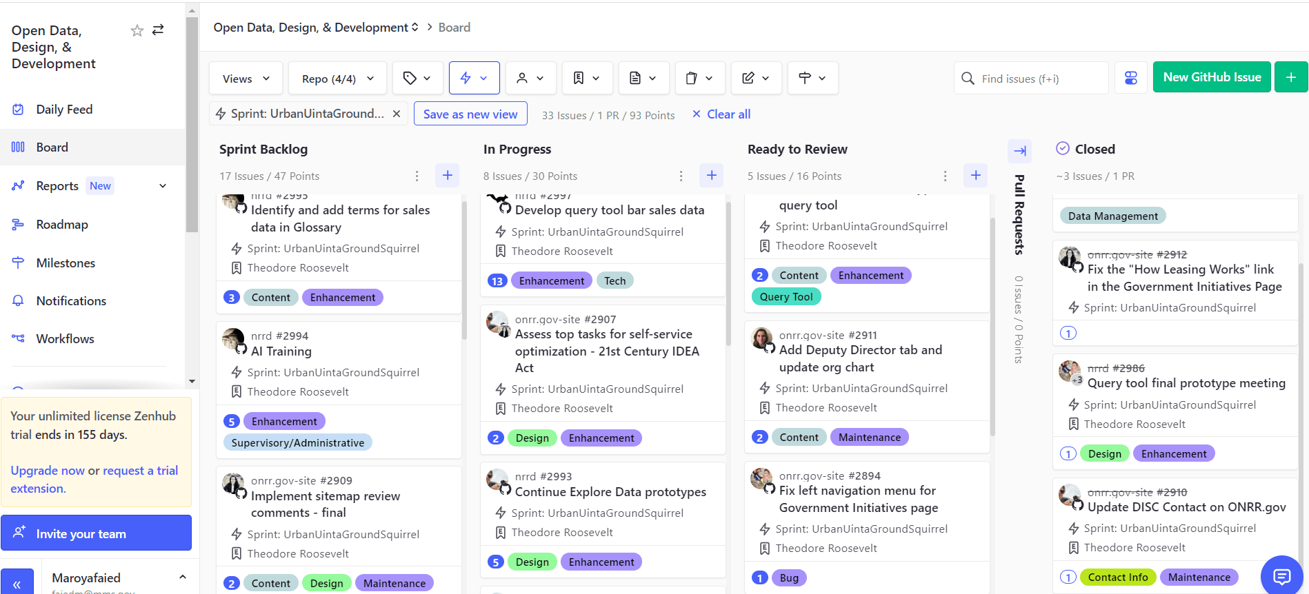 The ODDD team uses ZenHub for project management which integrates with GitHub. We utilize the milestone feature to document our sprint goals. In keeping with our team’s tradition of creativity and fun, we modify the sprint names by using an adjective and an animal name that both start with the same letter. We vote on these names at the beginning of each sprint, following alphabetical order. We utilize the Epic feature within ZenHub, for roadmap meetings. In line with our naming tradition, we modify the Epic names by choosing the name of a national park or national forest, again in alphabetical order.