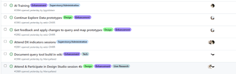 Some of our labels are an indication of the type of work such as “accessibility”, “user research”, content “enhancements”, “outreach”, etc. Some of our labels are an indication of the priority level for the task, such as “showstopper”, “high”, “medium”, and “low”. Some of our labels are an indication of whether the task is an “enhancement” for the website or regular “maintenance”. Using a combination of the labels is a great way to keep record of our work as well as for metrics measurements.