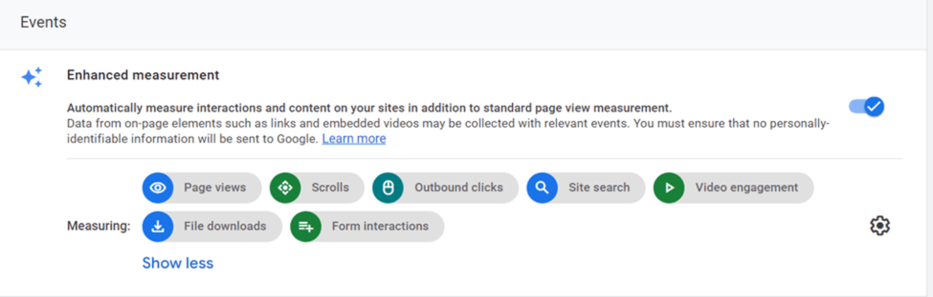 Note that even though they are not turned on in enhanced measurement, some of the events are still measured in DAP’s properties. The reports and explorations just need to be filtered differently to track such events.