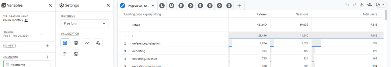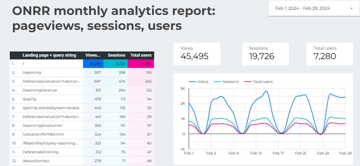 Pageviews, Sessions, Users | Landing page + query string | Views, Sessions, Total users | Hostname contains onrr.gov |