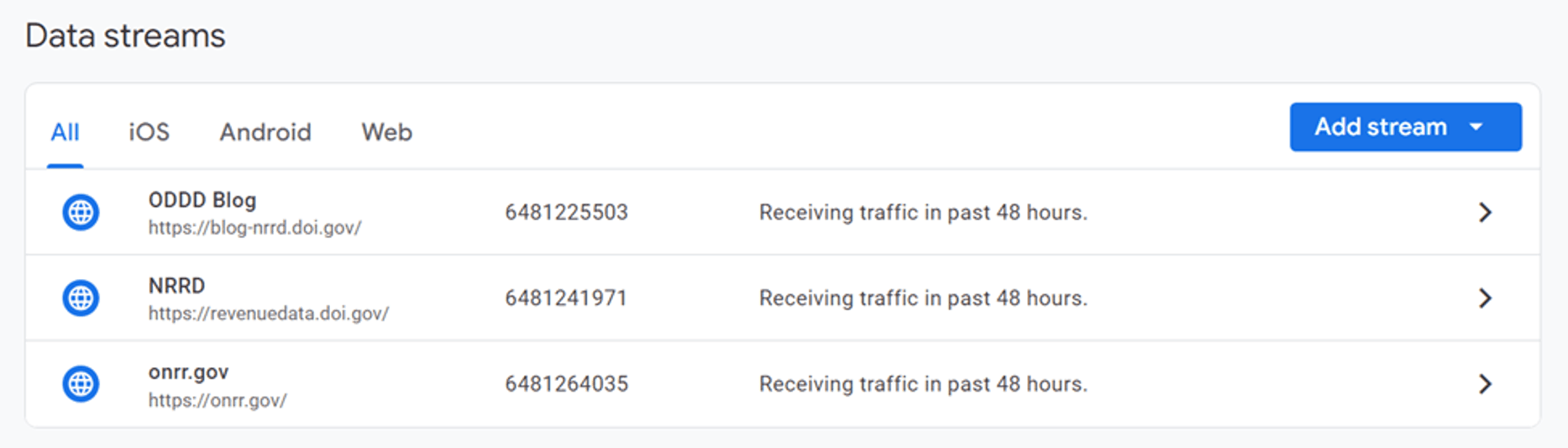 We set up our property with each website as a separate data stream. This differs from DAP, which has DOI as a sub-property and analytics.usa.gov as a single data stream. We use three data streams instead of a single data stream for two reasons: