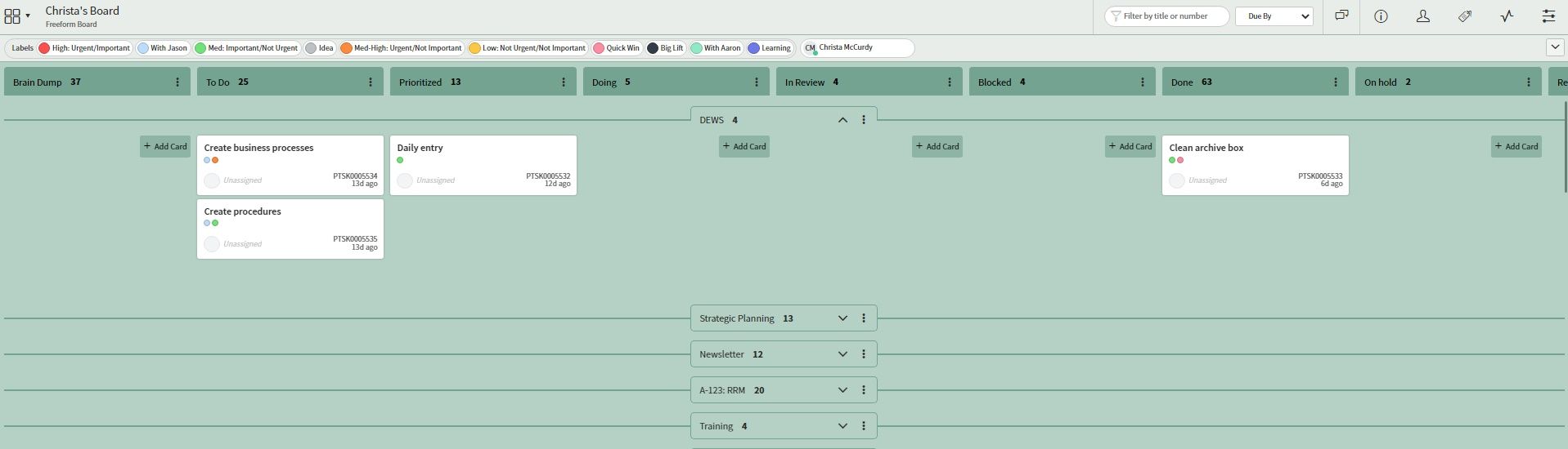 A digital and shareable board has many benefits. One can share a board with colleagues, assign contributors to individual tasks, add due dates, and create checklists. There are a variety of alternative digital task board options on the web, including Microsoft Planner, Asana, Trello, and others (while we find these tools useful, ONRR does not endorse any specific product).