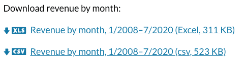 [Revenue by month, 1/2008–7/2020 (csv, 523 KB)](/downloads/csv/revenue/monthly_revenue.csv)