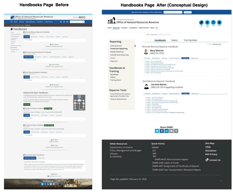 The functional purpose of ONRR.gov is to enable practitioners by providing them the tools and information required to be self-sufficient in completing tasks while minimizing dependencies. In exploring approaches to support this purpose, I conducted a competitive analysis of self-help knowledgebase systems. Working my way from complex to simple, I sketched a few variations of how we might condense content in a more consumable format and structure. After a few iterations, I landed on a simple, clean design applying Occam’s Razor design principle, which says to choose the one that incorporates the fewest assumptions.