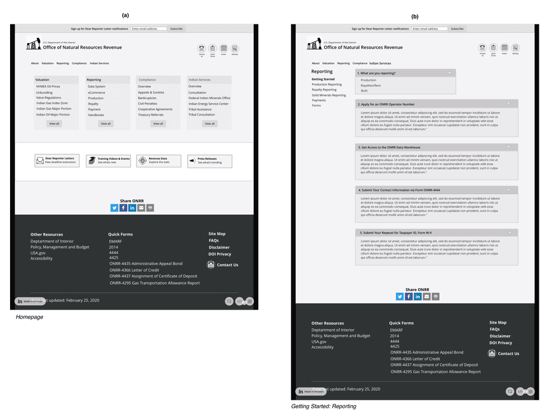 To build on concepts iteratively, we conducted a series of usability test sessions with lo-fidelity wireframes featuring 4 containers grouped by commonly accessed sections of ONRR.gov. Our strategy was to introduce a redesign with less information to learn what participants may be missing and if the existing information and its arrangement was meeting their expectations.