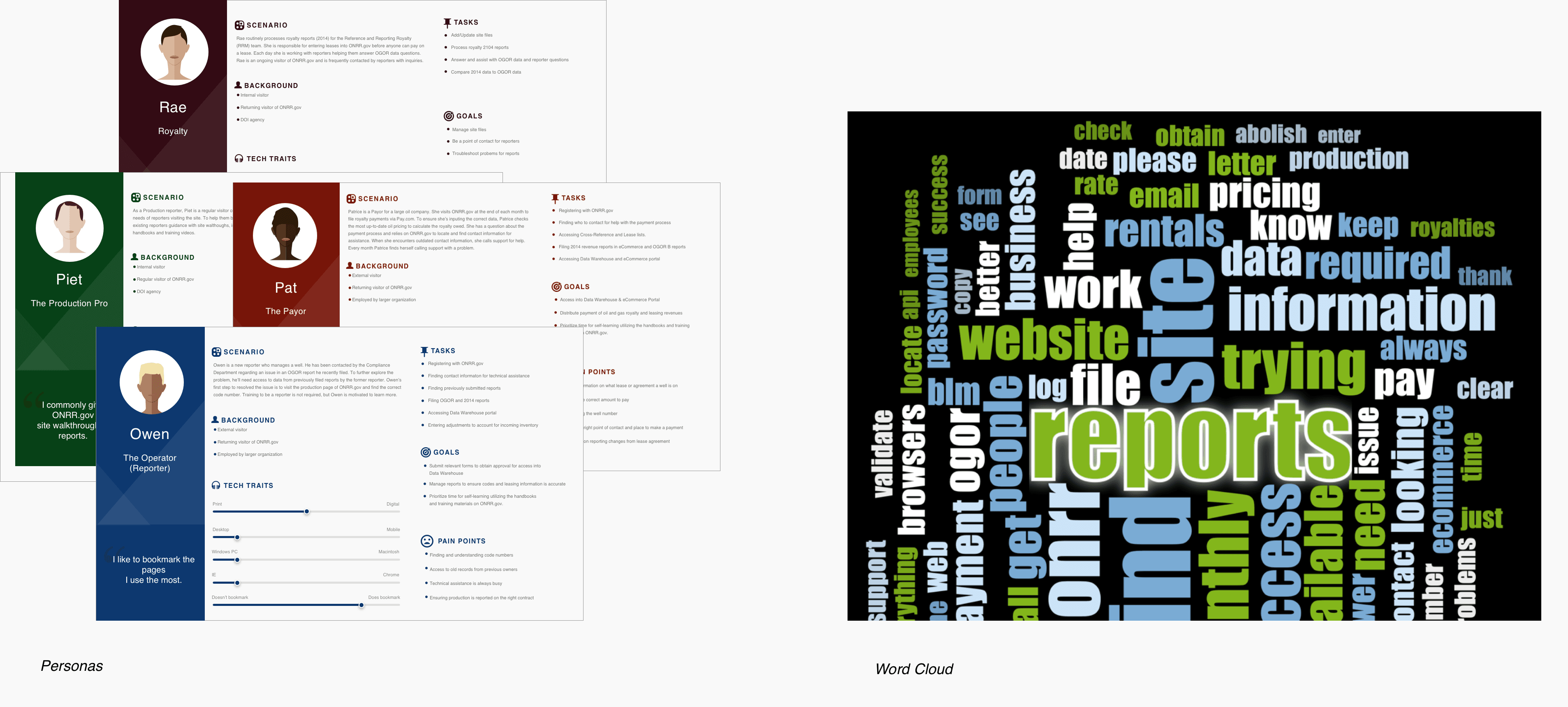 Using the insights captured from self-reported survey data and interviews, I developed persona cards representing the behaviors, goals, tasks, and technological savviness of our ONRR.gov audience. Specific terms, phrases, and verbatims from interviews and past surveys were recorded to generate a word cloud quantifying the terms most used by participants when discussing their experiences using ONRR.gov.