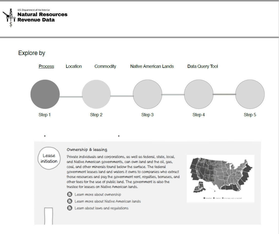 Shortly before I started my internship, the team took on the responsibility for a second site, ONRR.gov. For my project, I was tasked with starting the discovery phase of learning more about the needs of ONRR.gov users. Part of this process included adopting design thinking in the exploration and development of design concepts that we would use in usability testing sessions.