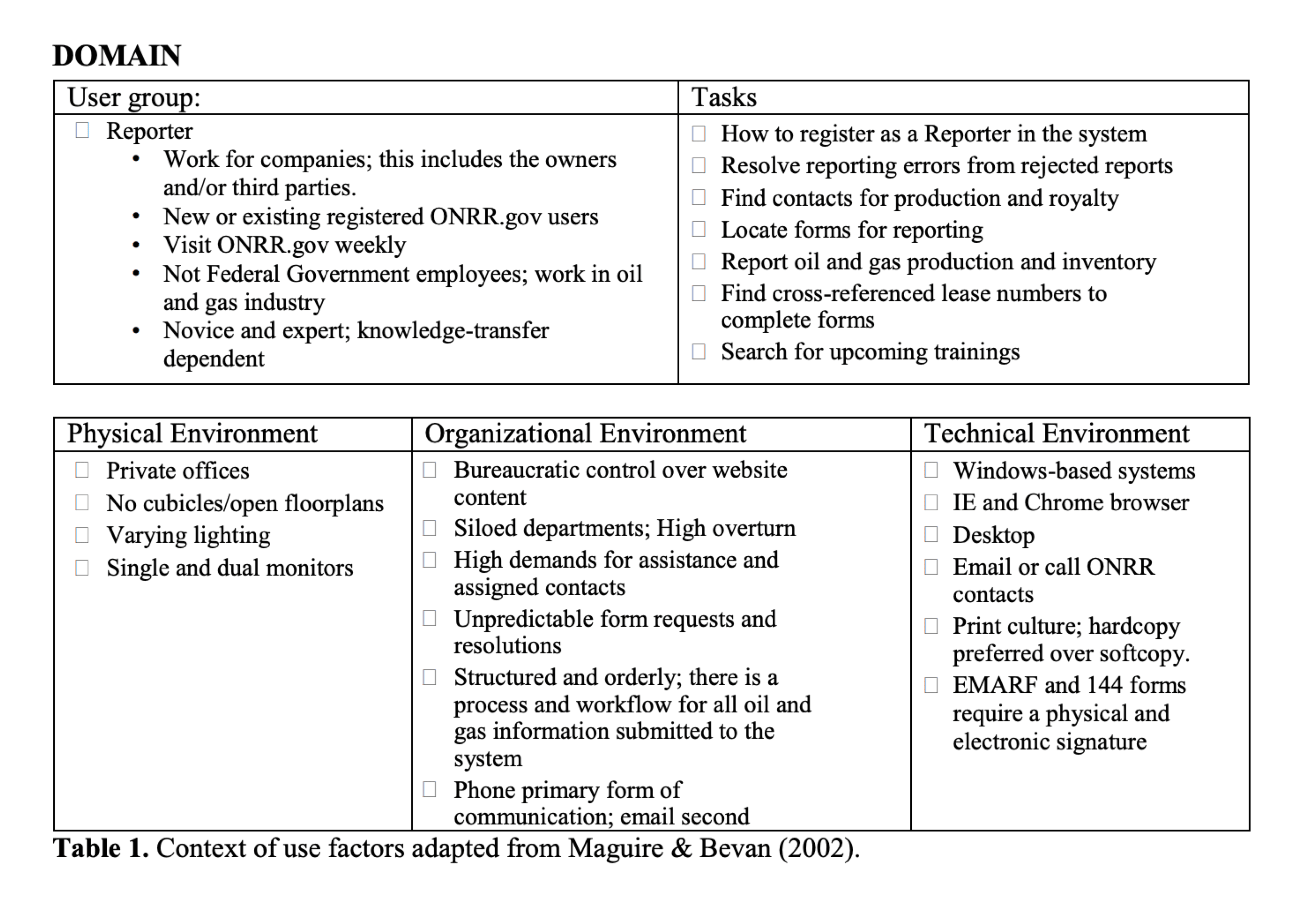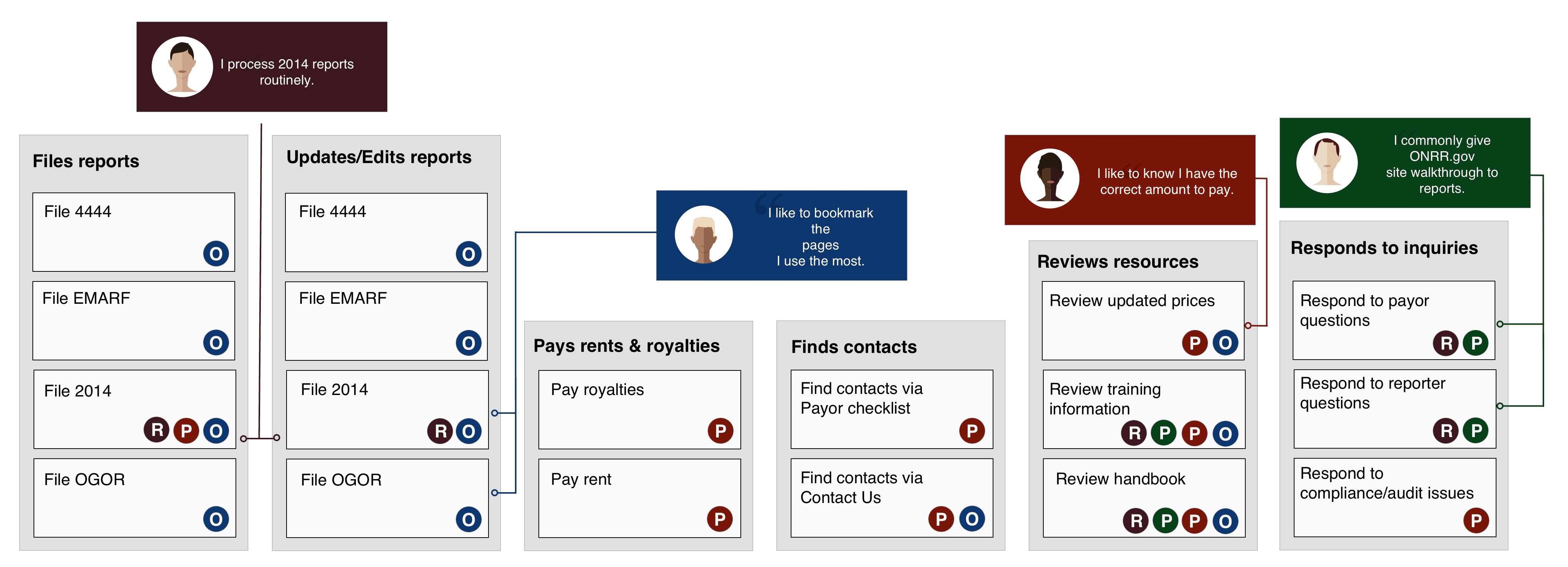What exactly is the emotional design experience of using ONRR.gov? Can users find what they need? Are they lost, frustrated, or delayed in accomplishing tasks? What time is allotted to explore, learn, and find information to get the job done or develop professionally? To understand the mental model of the ONRR.gov user and to empathize with their needs, I analyzed self-reported data collected from user surveys that had been conducted a few years ago and compared the findings to the current state of the ONRR.gov site. This allowed us to assess what was still relevant vs. what had been resolved in the ONRR.gov site design and its performance. I observed user interviews while taking notes and participated in debriefing with the team to discuss our observations.