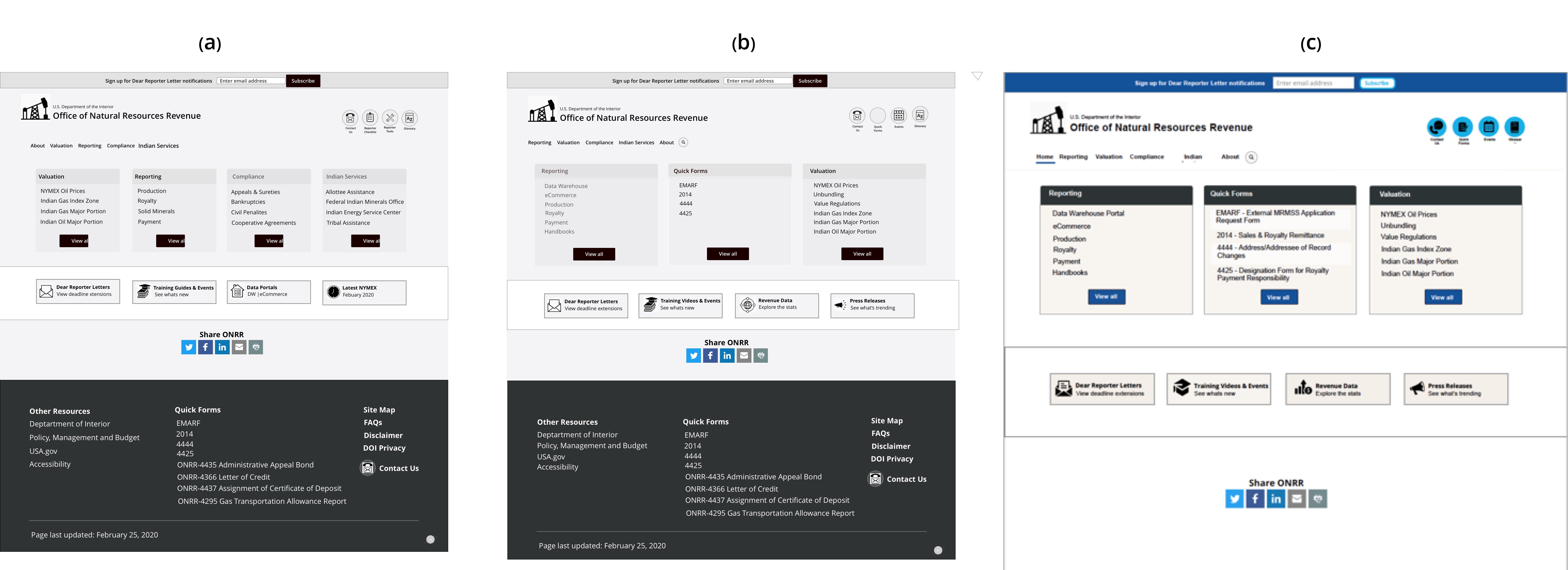Lo to Medium Fidelity Wireframes: Selection of wireframe iterations of ONRR.gov. From left to right: (a) First lo-fidelity wire tested in usability sessions; (b) Condensed layout to 3 cards with modifications to placement and arrangement of elements; (c) Medium-fidelity wire reflecting exploratory color scheme.