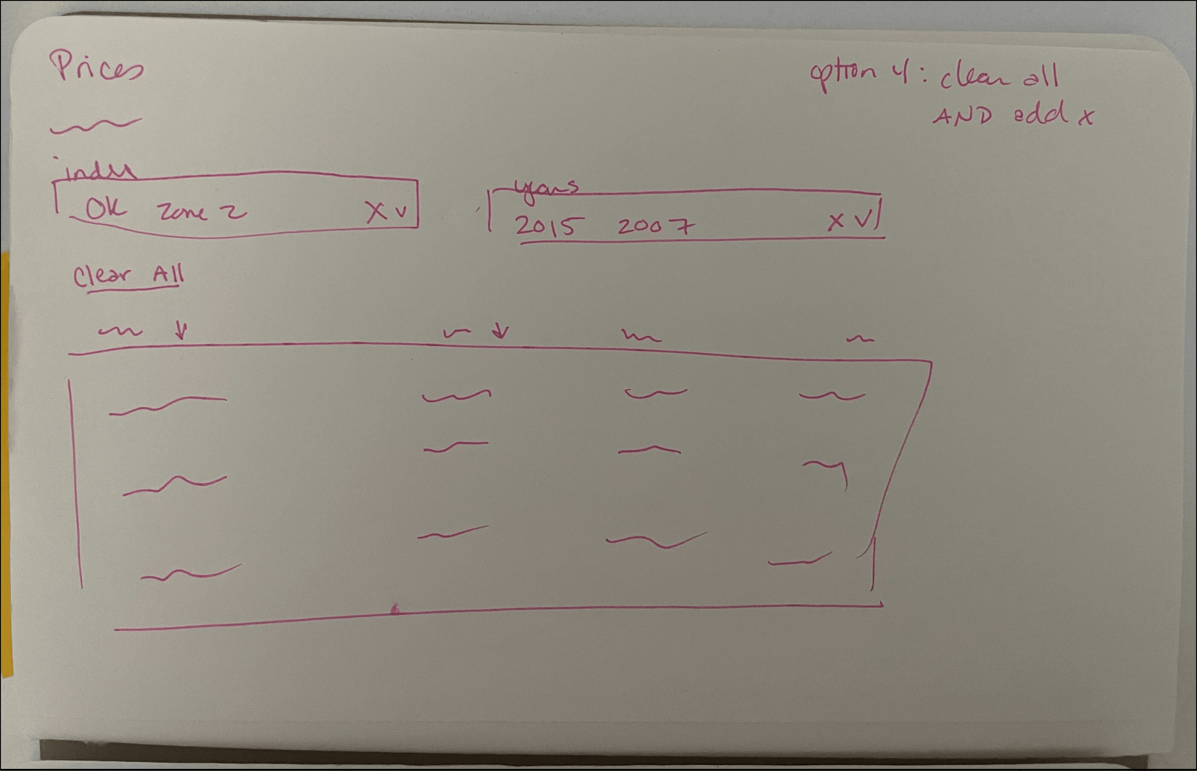The first recommendation we chose to address was “explore options for clearing filters” because it was a primary question that initiated this study. Based on the research findings, we decided to use the same participant poll, and gather their input on a few high-fidelity (hi-fi) prototype options for clearing the pricing table filters.