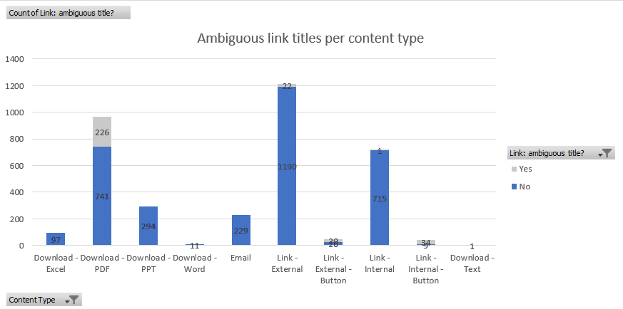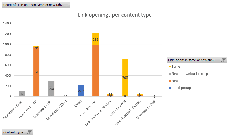 I also used pivot tables and pivot charts to quantify our three link questions. For our first question – how do links open? – I visualized the results by content type. The chart below shows the variation we have throughout the website. Once we improve our CMS, I will work to make sure there is consistency with how our links open.