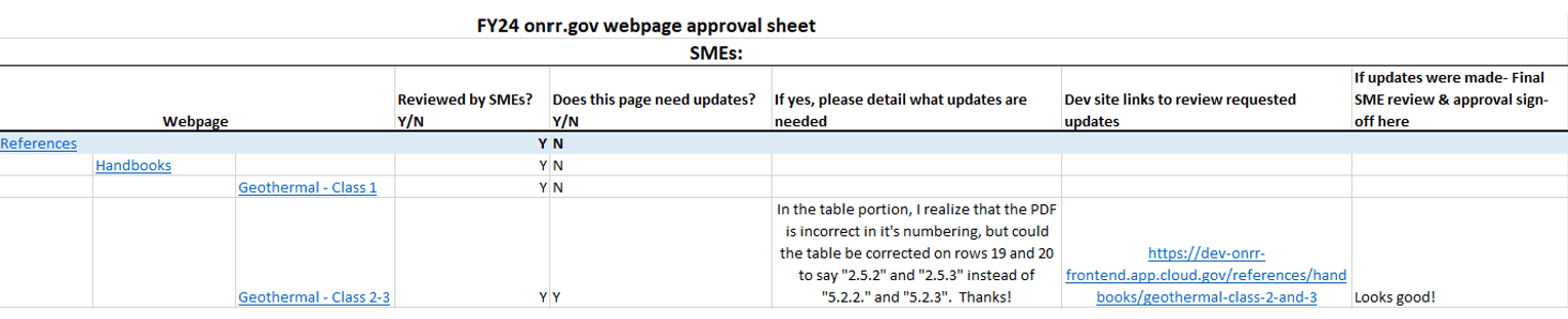 We incorporated SMEs during every step of our redesign of onrr.gov and previously outlined how we coordinated with SMEs during this process. In accordance with M-23-22 “Delivering a Digital First Public”, I established a content internal control process that involves SMEs to annually review and approve their public-facing content.