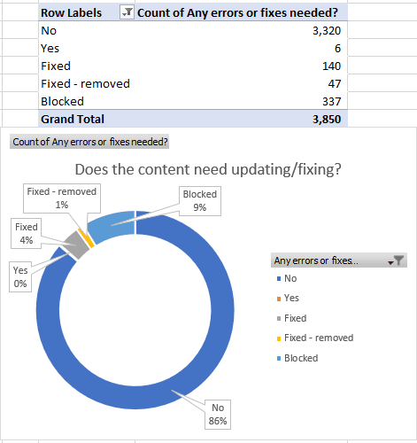 Because I cataloged my content into a functional database, I was able to create pivot tables and charts from the resulting pivots. I used these to visualize the amount of content that needed updating, which content types required updating, and to track my progress.