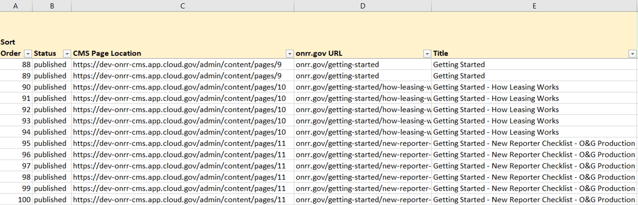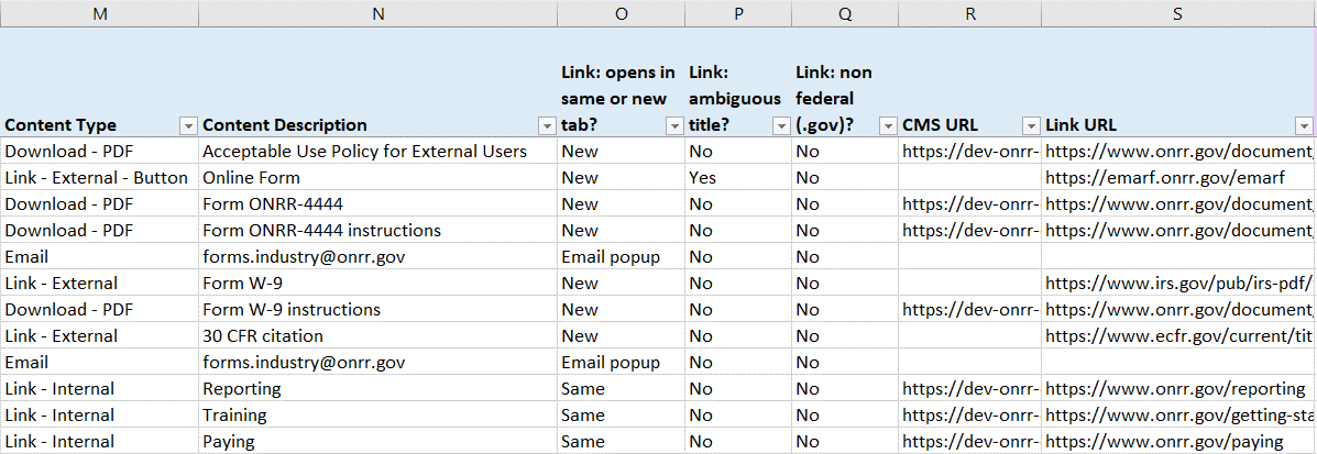 The first section of the content database includes columns for the CMS page location, onrr.gov URL, and page title. There are multiple line items per an individual URL location, which indicates multiple types of content cataloged.
