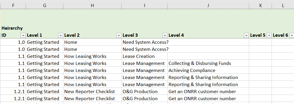 My first step of our new content internal control process was to create a hierarchy of onrr.gov. I cataloged the first three levels because there are several webpages where different program areas are responsible for different tabs within same webpage. By creating this detailed hierarchy, I made sure each section of the website had a program area assigned to it.