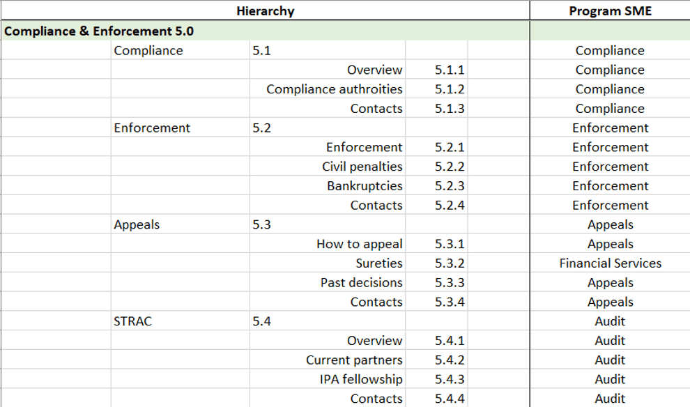 An excerpt of the ONRR hierarchy sheet, showing which program areas are responsible for each section of a webpage.