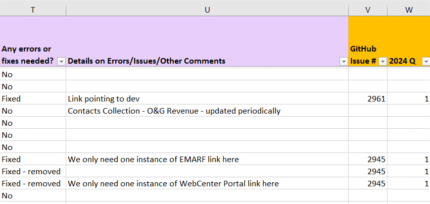 The fourth section includes the audit. I noted if any errors were found and detailed what needed to be addressed. I also noted the GitHub issue for each update and what quarter it was completed.