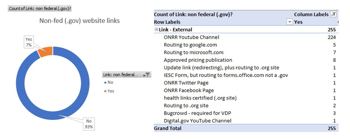 All the non-federal links were classified as external links. Of those external links, I identified 255 that were directing to a non-federal website. Once we improve our CMS, I plan to implement proper indicators for these links.