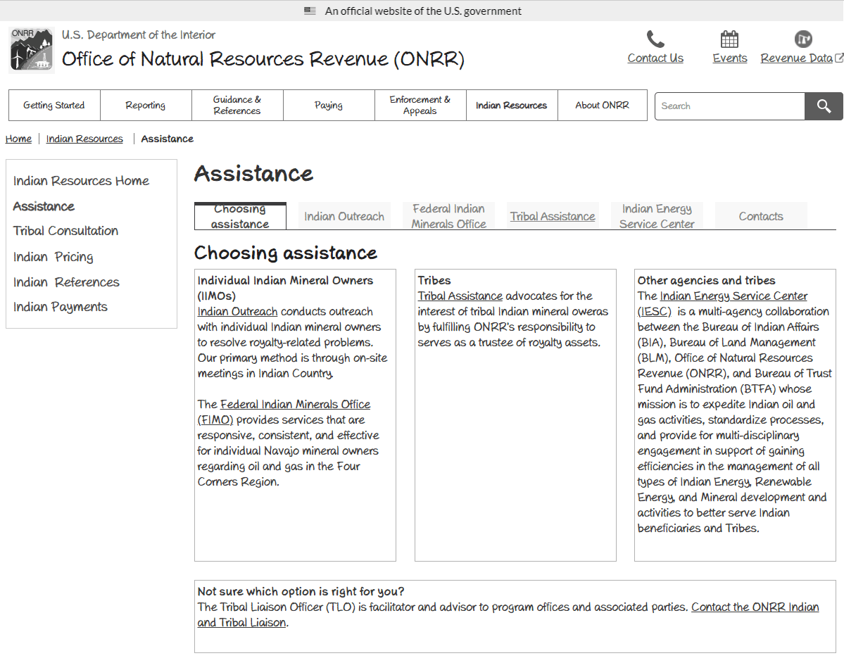 We took a different approach to redesign the Office of Natural Resources Revenue’s (ONRR) primary website, ONRR.gov. ONRR.gov’s primary goal is to communicate about the agency and reporting requirements. To reach this goal, we needed to partner with internal stakeholders from all areas of ONRR. This enabled us to learn about the domain before we could begin to better explain things to users. Our approach was to iteratively review wireframes with each team at ONRR.