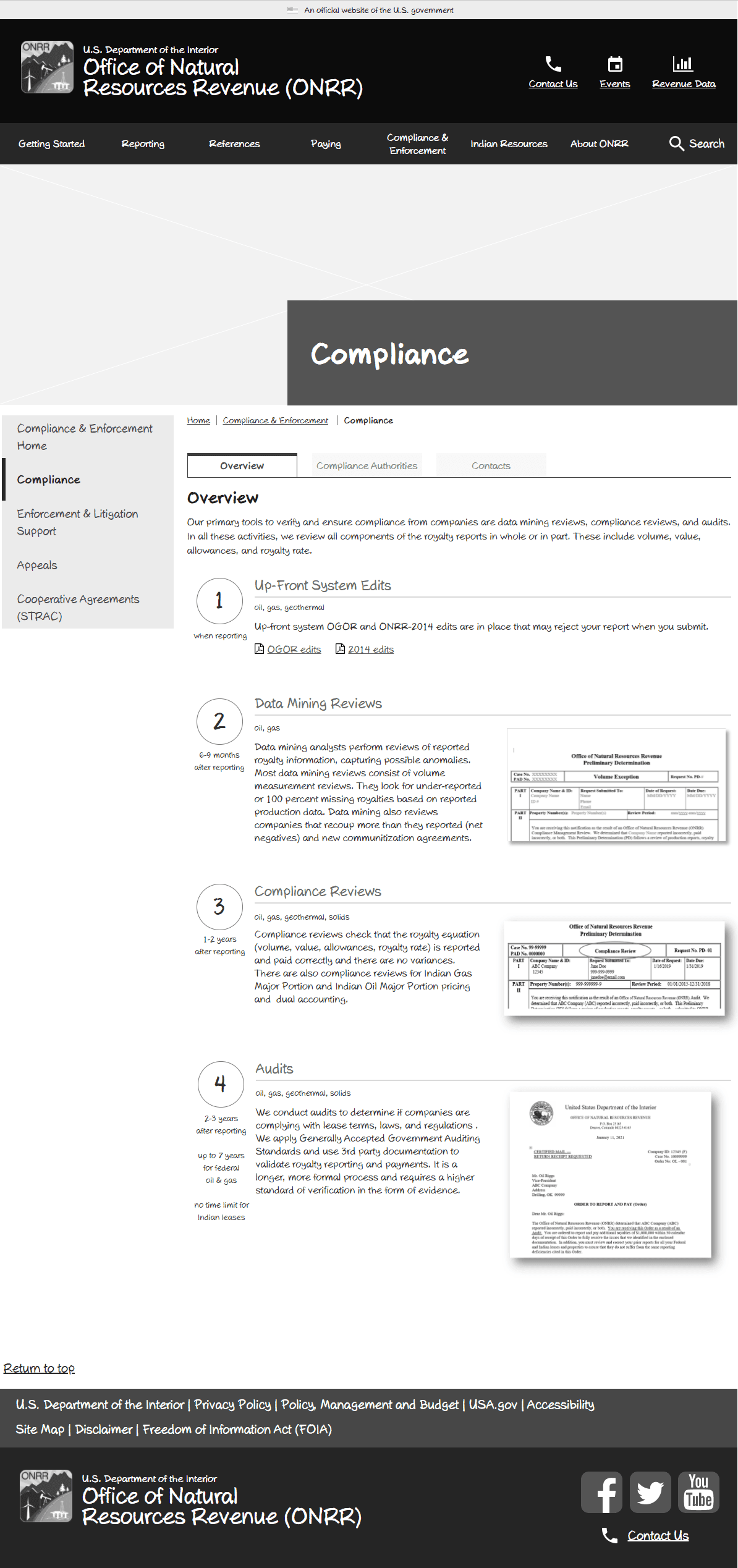 Existing reporters and payors use the site monthly to access ONRR’s reporting portal. They have to submit reports for their oil, gas, geothermal, or solid minerals production and revenue. These users look on ONRR.gov for handbooks, pricing information, and lease numbers or codes to put on their reports. They also use information about submitting payment of the amount they owe ONRR. Some may look for information about compliance if they get a letter about enforcement.