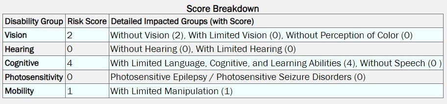 Once the report has been completed, it’s saved on your local machine as a JSON file and can be then uploaded into the View Report section of ACRT. The report displays each test criteria in the same format as the form but has the option to filter the conditions by whether they passed, failed, or did not apply. This makes it easy to view only the test conditions that failed. The report also provides a risk score breakdown, which details the disability groups impacted by the identified issues on the page.
