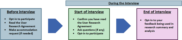 We wrote a user research participant guide to make sure that participants could be fully informed about the research process. The guide describes what it’s like to participate in user research before, during, and after the interview. The 3 different “opt-in” consent points are noted in the process. The participant first opts in by agreeing to participate in the user interview. The second opt-in occurs at the beginning of the interview. We ask participants again at the end of the interview for their 3rd opt-in.